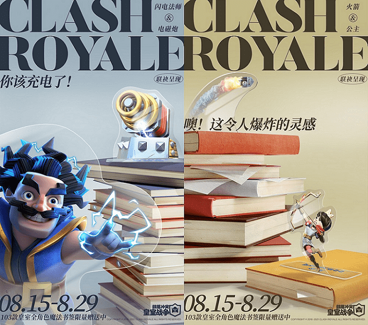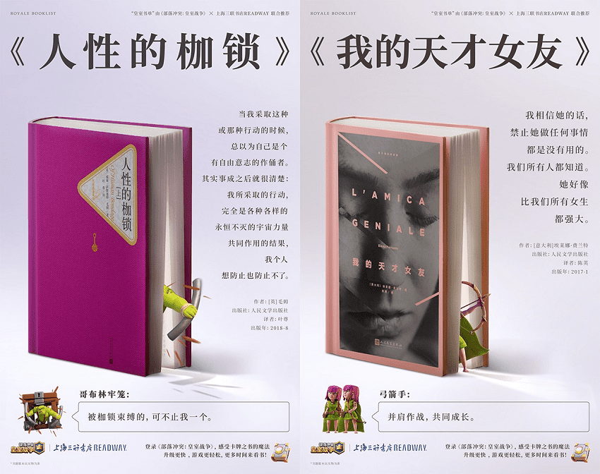 大众耳熟能详的读物与特点鲜明的游戏角色形象放在一起,即使是不熟悉《皇室战争》的朋友应该也能看出个大概,这些书,每一本的标题或内容都与其中一个特定的角色微妙相关。而对于玩家来说,则更是有梗有趣、每一组都可以细品的对应。