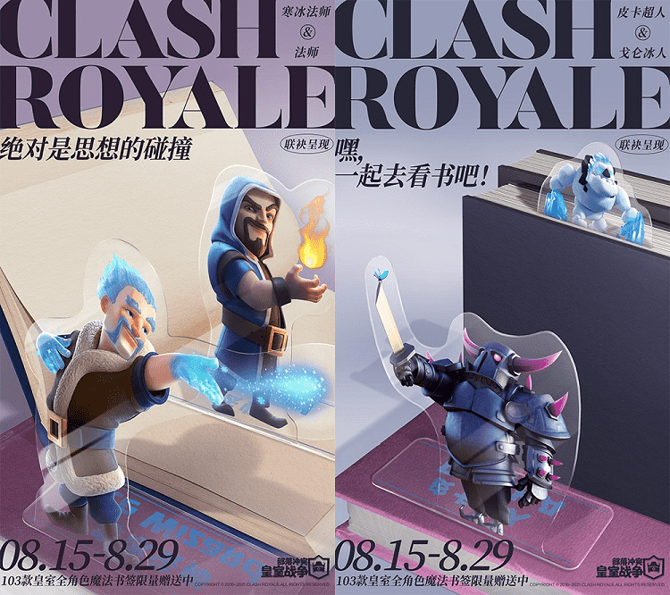 为了让更多无法去到现场的玩家也能感受到书的魔力,现场将103个卡牌人物制作成了103款书签,折叠立牌的形式让它介乎于书签和游戏周边之间,拥有更多使用和展示的场景。只要在活动期间参与《皇室战争》官方线上活动,就有机会获得——对,这次,游戏官方的活动不送道具,不送礼包,只送书和书签。