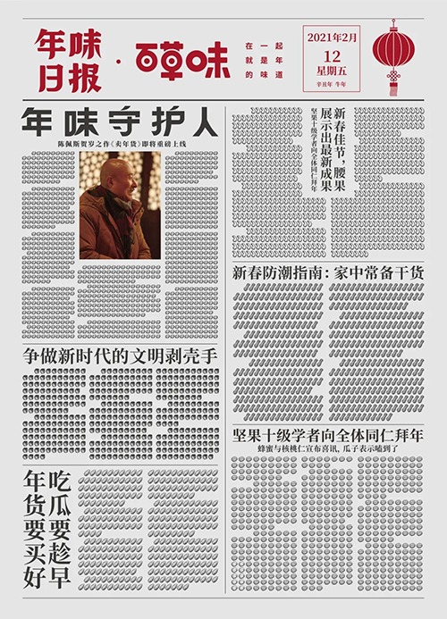 所有的报纸,都经过独特设计,坚果作为文字,构成了这份年味日报。