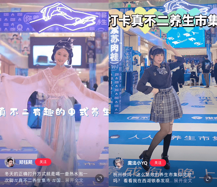 “三坑少女”身穿个性迥异的汉服和JK制服到场赶集,通过现场打卡这一喜闻乐见的形式,传递中式养生的风潮。或温婉或甜酷或仙气飘逸的风格,制造了强势吸睛效应。情景化演绎的创意手段,具象化还原了“中式时尚养生”的现场。与此同时,借力粉丝目光与网络热点的聚焦,真不二·养生市集进入大众视野,也实现了真不二产品在社媒的高频现身。