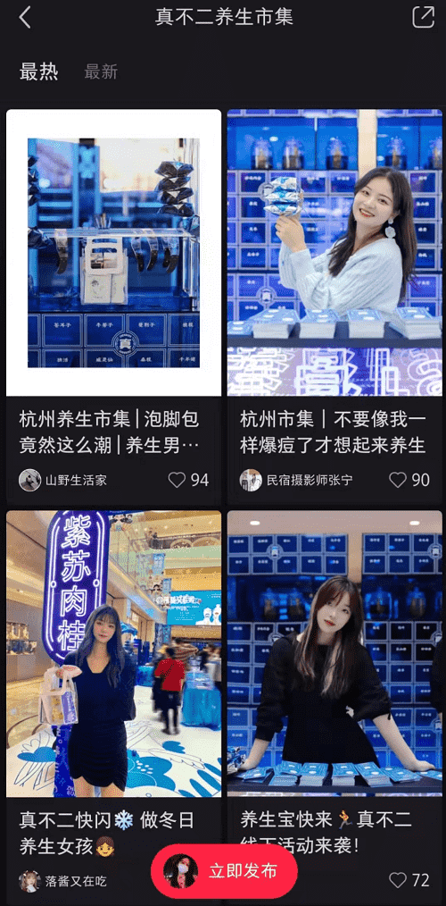 作为年轻人生活方式决策平台,小红书也是实现品牌“种草-拔草”的流量转换地。银泰百货联手真不二,同步在小红书发起#真不二养生市集##真不二银泰#话题,依托多角度、强互动的达人创作与风向引导,让无法到场的用户身临其境地感受到养生市集的实际魅力。